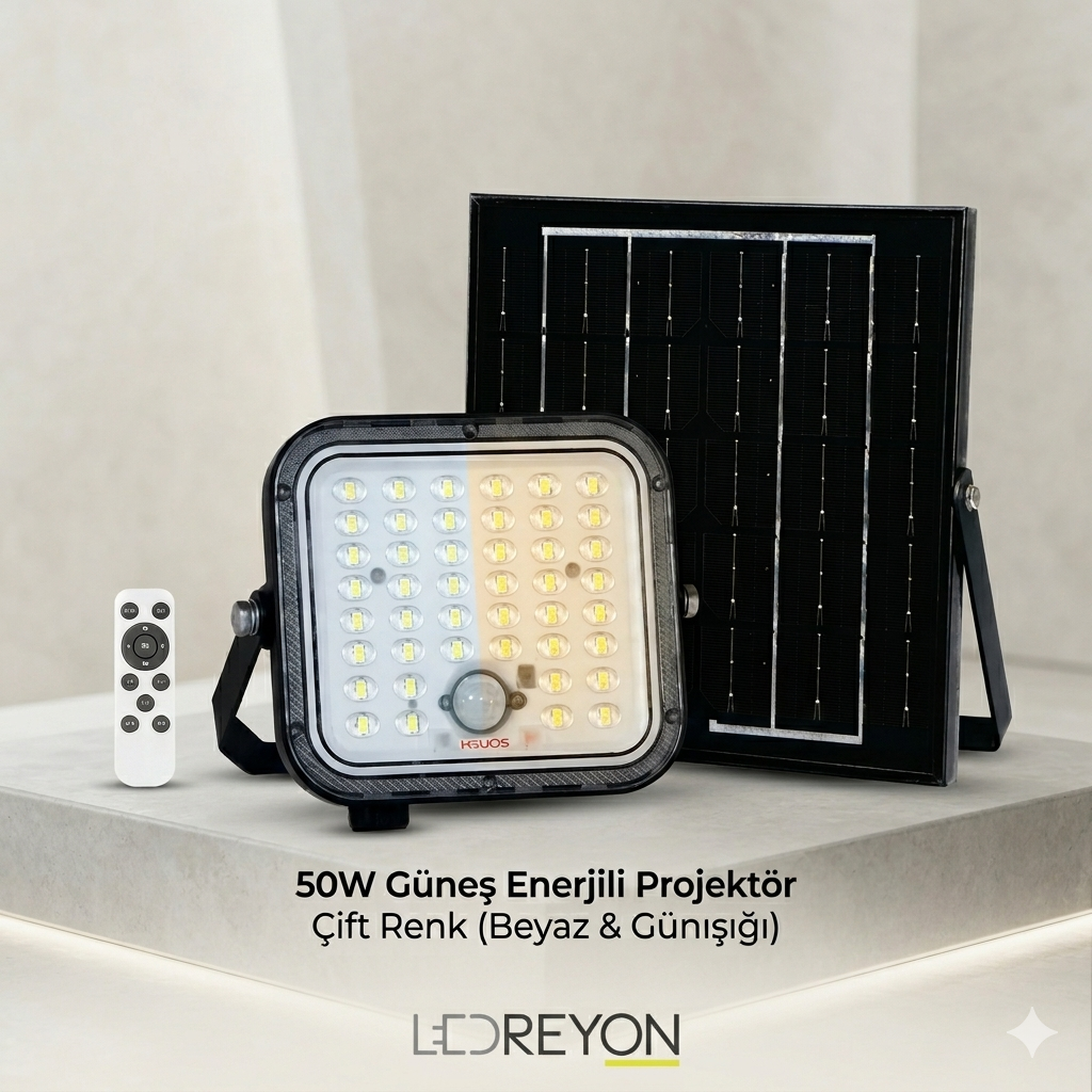 50W Solar Led Projektör Dış Mekan Bahçe Aydınlatma 2 Renk Fonksiyon Kumandalı